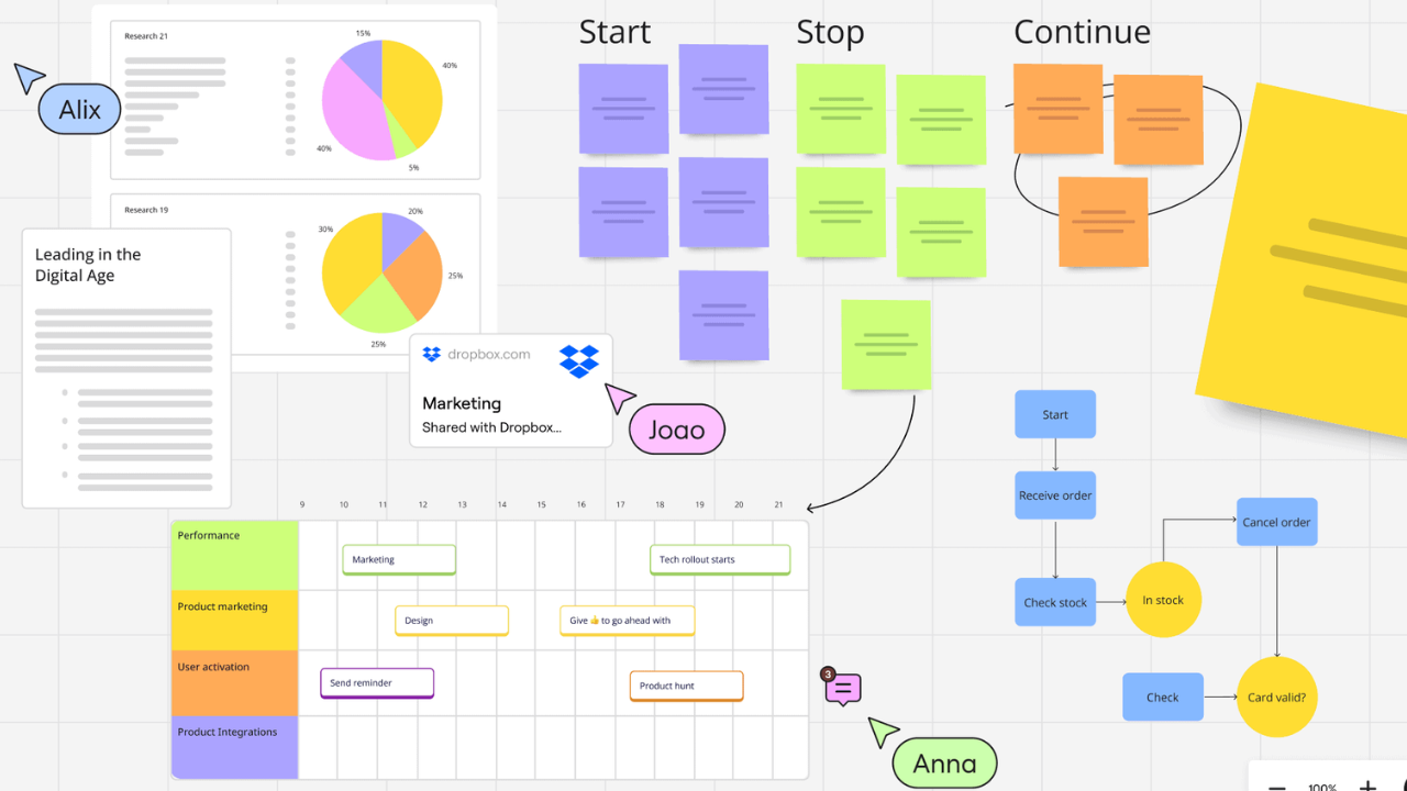 Miro ist ein digitales Whiteboard-Tool, das Teams hilft, Projekte zu planen und Ideen zu visualisieren. Ob Projektplanung, Brainstorming oder Kunden-Workshops: Mit Vorlagen und Projekttrackern behalten selbst kleine Unternehmen den Überblick.